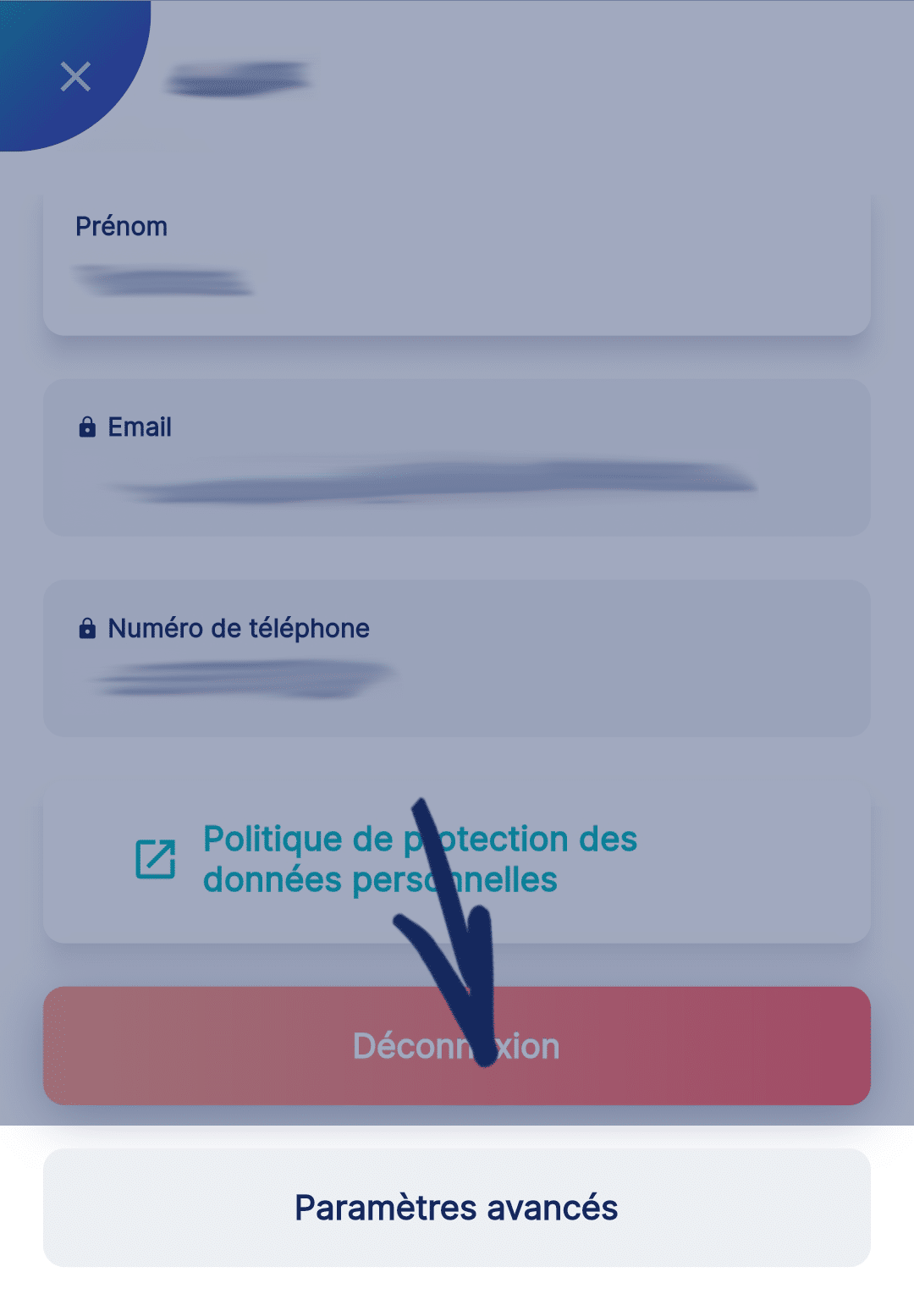 Appuyez sur « Paramètres avancés » puis appuyez sur « Supprimer mon compte ».